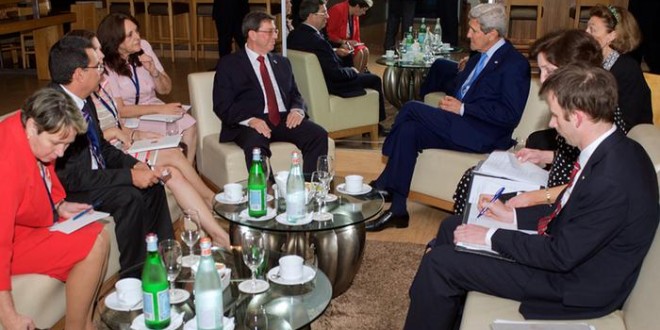 Kerry și Rodriguez și-au strâns mâinile în fața camerelor de luat vederi înainte de a începe o discuție consacrată diverselor aspecte legate de reluarea relațiilor dintre Washington și Havana, după mai mult de cinci decenii de ostilitate.