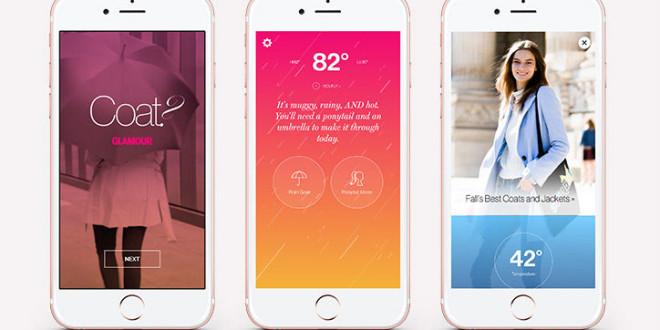 Revista Glamour a lansat o aplicație numită „Coat?”, în colaborare cu Apple, care dă indicații despre hainele care trebuie purtate, în funcție de vreme. Aplicația joacă astfel rolul unui meteorolog, care are însă și o accentuată grijă față de utilizator, scrie 7sur7.be, preluat ed Agerpres.